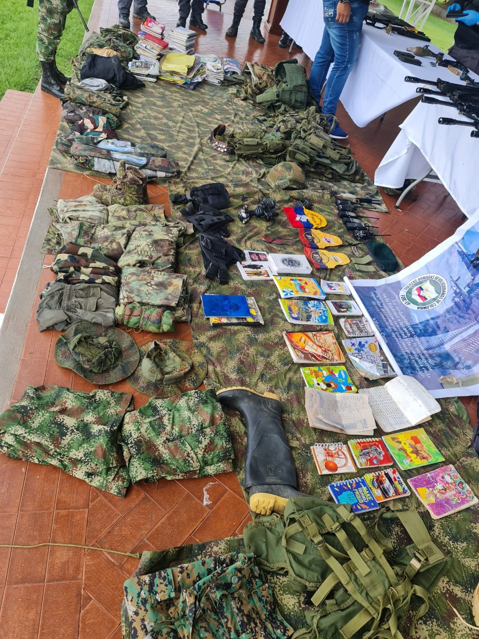 Además, se encontraron 7 computadores, 3 cargadores para computador, 6 radios, 1 cargador de radio, 2 teléfonos celulares, 1 lente de visión nocturna, 1 escáner de metales, 1 mira telescópica, 5 cartillas, 1 pendón y propaganda alusiva a las extintas FARC-EP.
