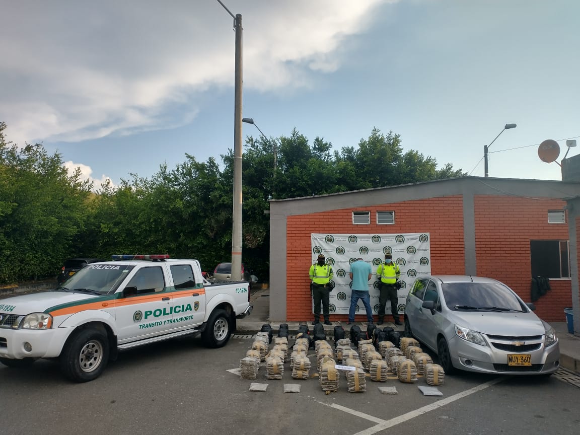 En actividades de registro y control en la vía Andalucía km 49+500 jurisdicción del municipio de La Victoria, personal de Tránsito y Transporte logra la captura de un hombre, quien se movilizaba en el vehículo automóvil Chevrolet Sail, el cual transportaba varios paquetes en lonas de colores y en su interior el estupefaciente.