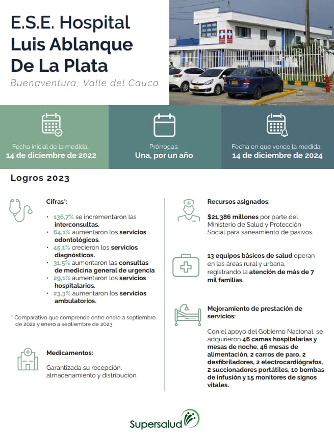 Bogotá D.C., Colombia . – El Gobierno en cumplimiento de su política de recuperar los hospitales públicos para garantizar más y mejores servicios a los usuarios, continúa trabajando en la estabilización de la red pública hospitalaria del país, es el caso del Hospital Luis Ablanque de la Plata ubicado en el Distrito de Buenaventura que luego de un año de haberse empezado la intervención forzosa para administrar, gradualmente viene implementando las acciones correctivas previstas en el plan de acción para fortalecer la prestación de los servicios y la recuperación financiera de la entidad.