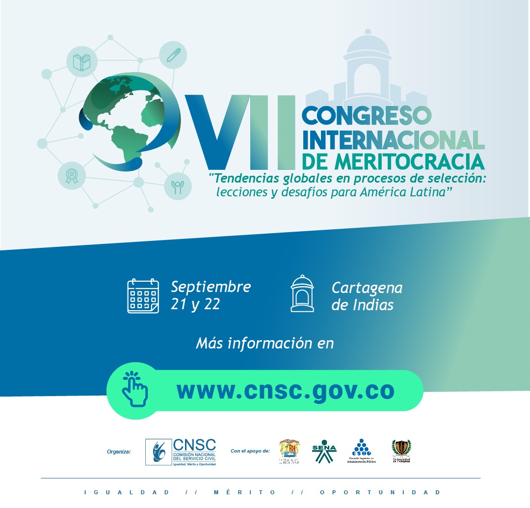 Bogotá D.C., Colombia . – Este 21 y 22 de septiembre, la Comisión Nacional del Servicio Civil (CNSC), entidad que desde su creación hace 19 años ha realizado 91 concursos de mérito o procesos de selección con los que ha provisto más de 326.000 vacantes de carrera administrativa en más de 4.900 entidades del Estado, realizará el VII Congreso Internacional de Meritocracia, el cual tendrá como tema central las “Tendencias globales en procesos deselección: lecciones y desafíos para América Latina”.